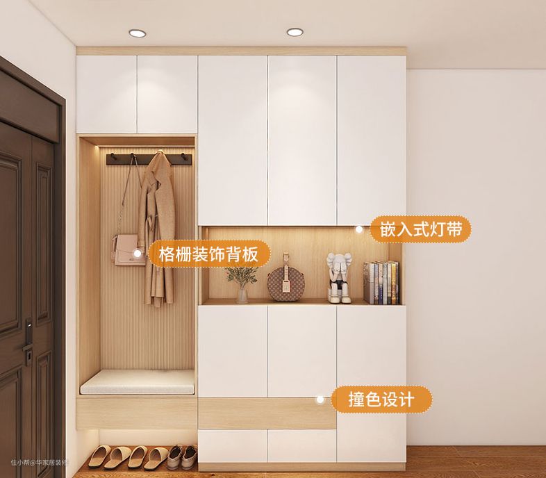 入户的玄关做了置顶的玄关鞋柜,换鞋凳,挂衣区,灯带搭配白色和原木色的柜体,有种高级美,功能齐全