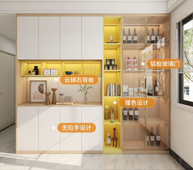 餐边柜更是超强收纳,一半做酒柜一半做收纳柜中间做了开放格用于摆放装饰和,酒柜隔板中嵌入灯带氛围感拉满,开放格和收纳柜进行撞色,让整个墙面都亮了。