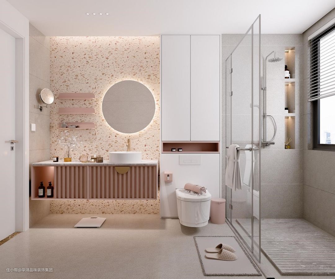 主卧卫生间内部打造了干湿分离的格局,在象牙白主色调中间又融入了砖红色进行色彩的点缀。