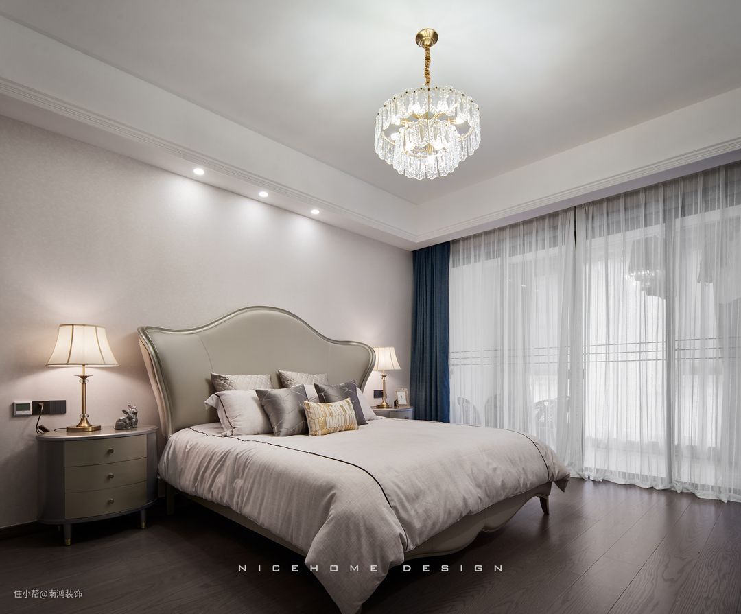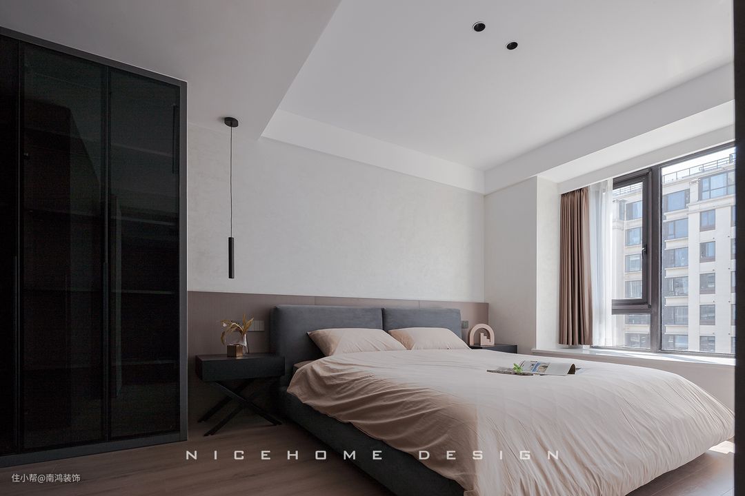 另外,卧室的窗帘千万不要用拼色的,搞得花里胡哨不利于休息,就用纯色的窗帘,既高级还有助于睡眠。