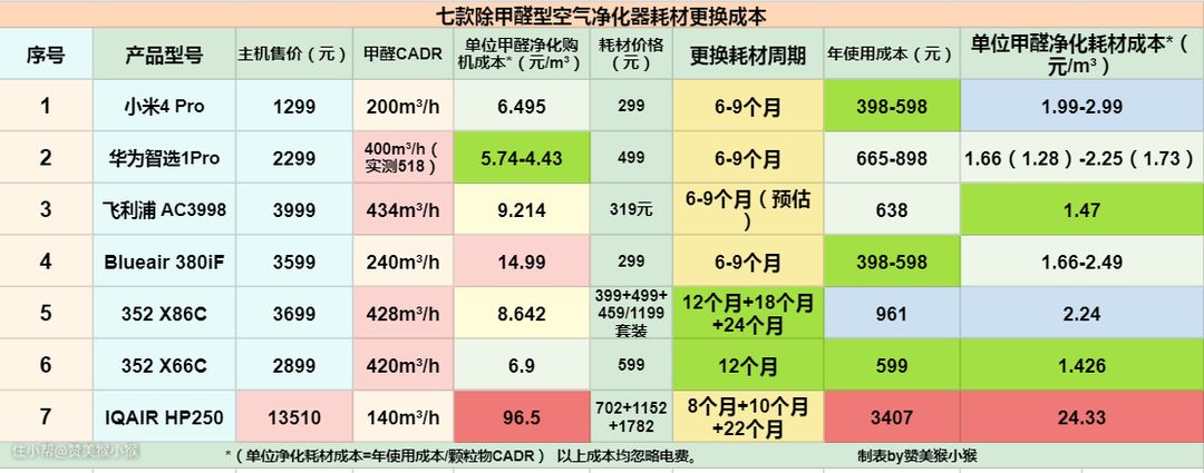 首先来看单位购机成本比较,7款机型中华为智选1Pro凭借2000出头的价格和高甲醛净化参数,性价比最优。
