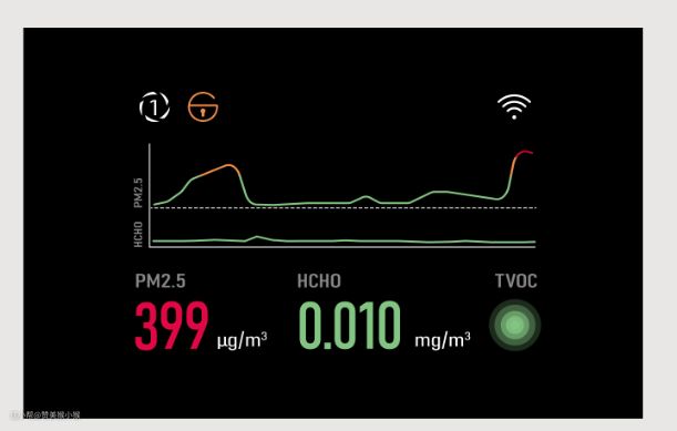 内置的气体污染物传感器可以对甲醛,PM2.5以及TVOC和温湿度等参数进行显示和记录,并且以曲线形式显示,非常直观。