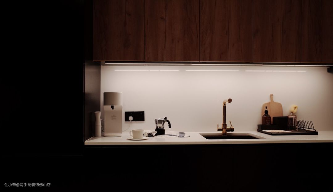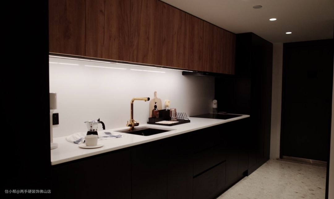 厨房两边是高柜,左边藏的冰箱,右边是各种备用调料储存间。