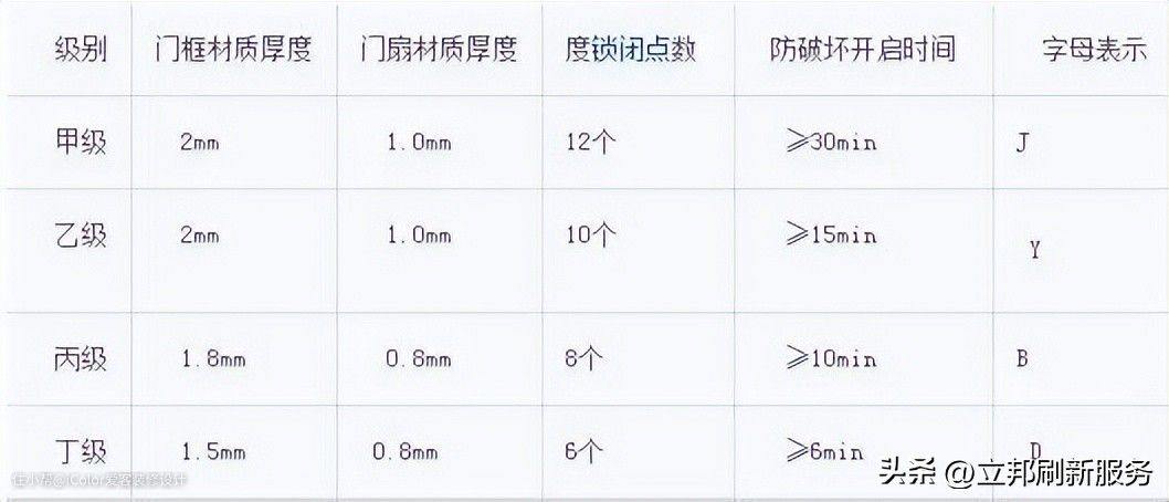 甲级、乙级框面材质厚度为2.0MM,丙级为1.8MM,丁级为1.5MM。甲级锁闭点12个,乙级锁闭点10个,丙级锁闭点8个,丁级锁闭点6个。