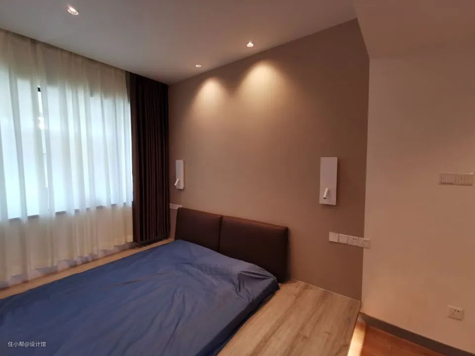 床头上方装上射灯,把射灯角度对着床头墙,让床头墙更加明亮有层次感,同时睡前靠在床头看书刷手机的时候,只需保留射灯开启,光线通过墙面反射而来,也能实现更加温和舒适的照明效果。