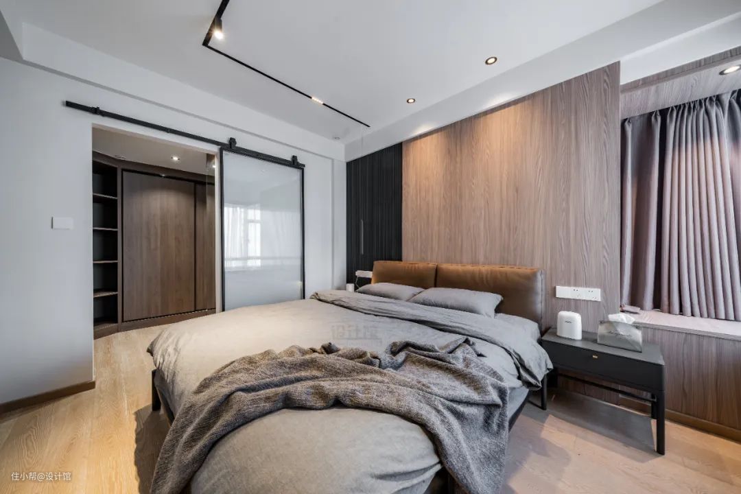 在床头墙的墙脚做护墙板的话,可以在护墙板上嵌入灯带,让灯带与护墙板融为一体,同样可以做到见光不见灯的无主灯设计效果,让空间显得简洁明亮而大方。
