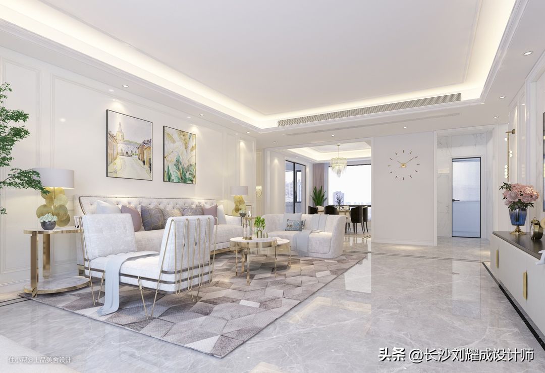 客厅造型配以欧式简约线条,搭配电视背景墙的大理石和沙发背景墙的挂画,色彩方面采用明亮温馨当下流行的奶油色,让空间看起来时尚现代而复古,让空间看起来温馨还有点小奢华