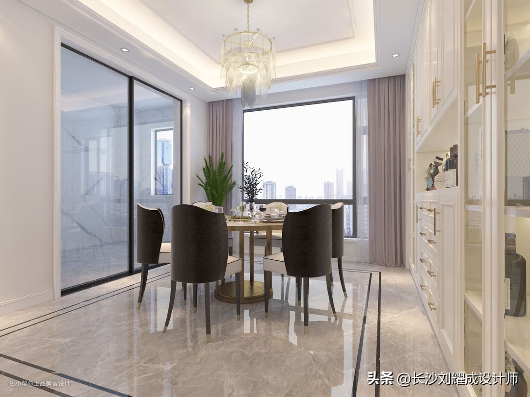 餐厅最吸引人的地方就是酒柜的设计,奶油色的酒柜,对称式玻璃展示柜中间带柜门的柜子,配以金色拉手,看起来精致而高雅,圆形金属大理石餐桌与金色水晶灯相互辉映,瞬间让餐厅气质高雅温馨起来