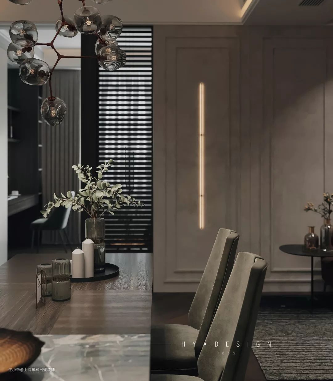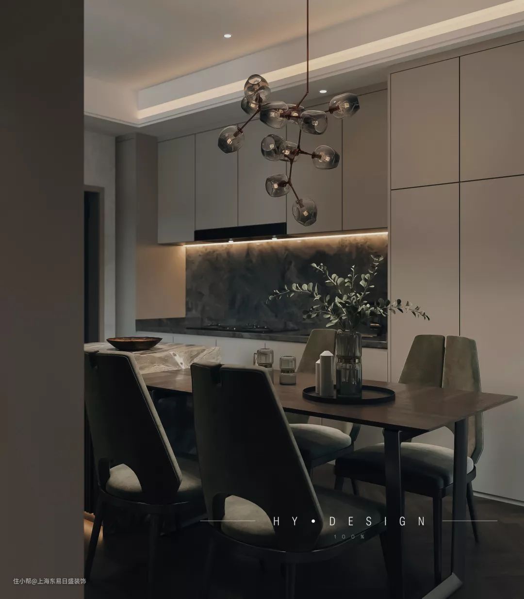 餐厅选用了精致的枝形灯,雅致的形状搭配黑色透光玻璃,让整个空间呈现出独到的质感和神秘感。业主偶尔会邀请好友来家做客,所以特别布置了四人座的餐桌,方便随时举行家庭聚会。