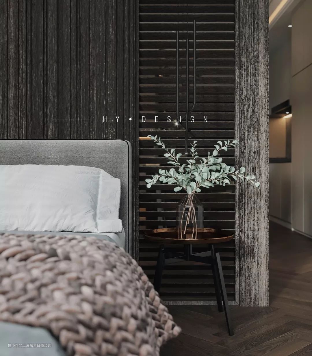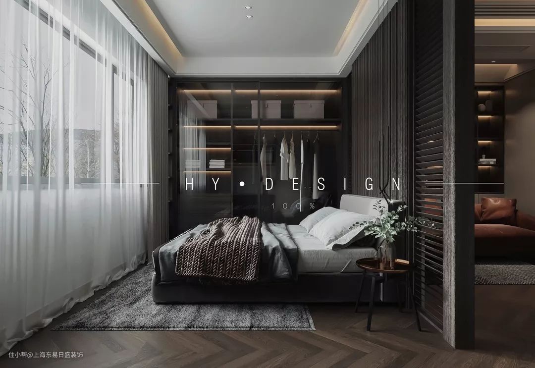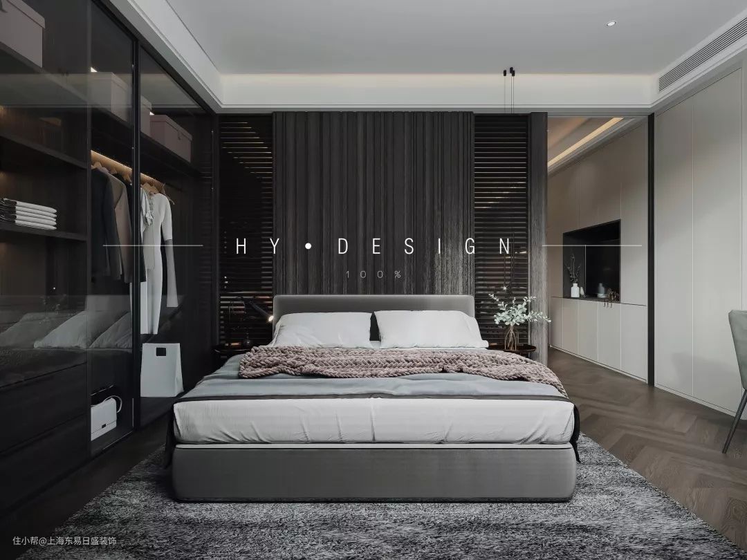 主卧与客厅之间使用了吊轨门,平时敞开卧室门,能够保证客餐厅最大限度的采光。床头背景墙使用了质感极强的黑色木材,既能够凸显业主独到的生活调性,也完全不失材料上的温润雅致。
