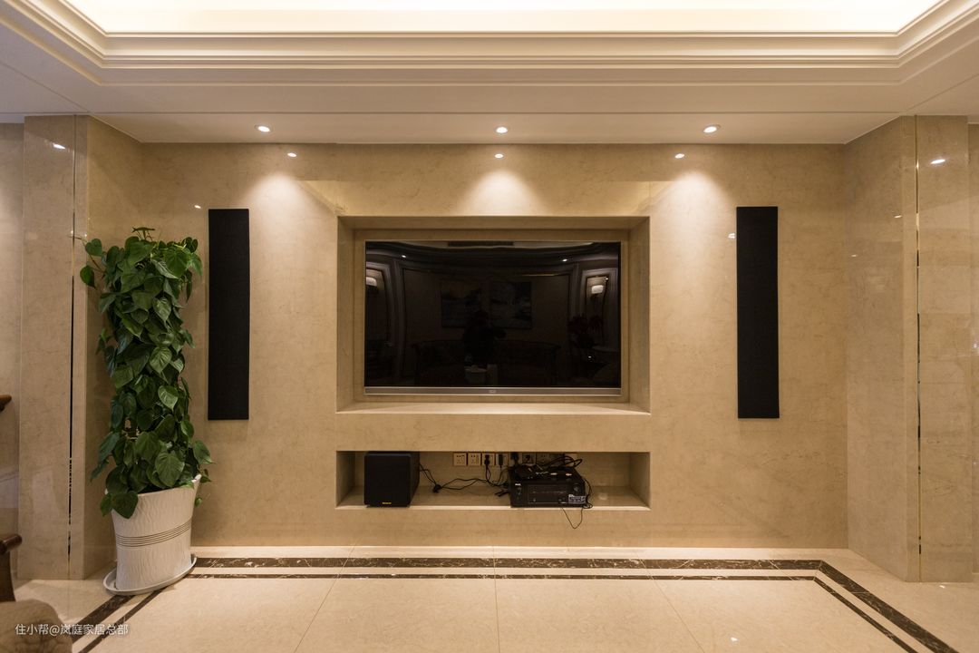 电视背景墙简单设计,以瓷砖通铺,将中间掏空,让电视嵌入其中,点状的吸顶射灯,和充满自然气息的绿植搭配,延绵舒展富有生命力,依附在宽厚涡卷纹上,刚柔并济,复古而华丽的设计成就了别具一格的新古典系列套装。