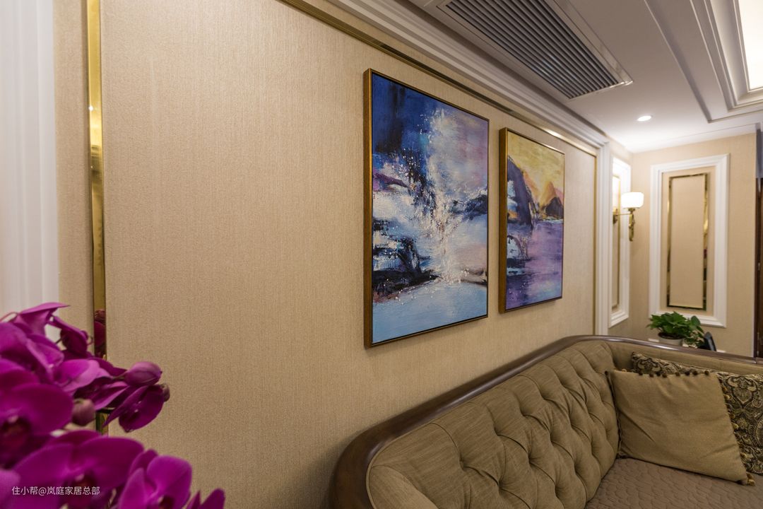 细看背景墙,颜色艳丽的蝴蝶兰成为整体的一抹亮色,与同色系的装饰画相呼应,自然质感的纹理,精益求精的细节,加上古朴清贵的木色温润柔和,为其增加了调性,融入文化元素将城市生活缓缓道来。生活时刻与精致对话,与经典共鸣。