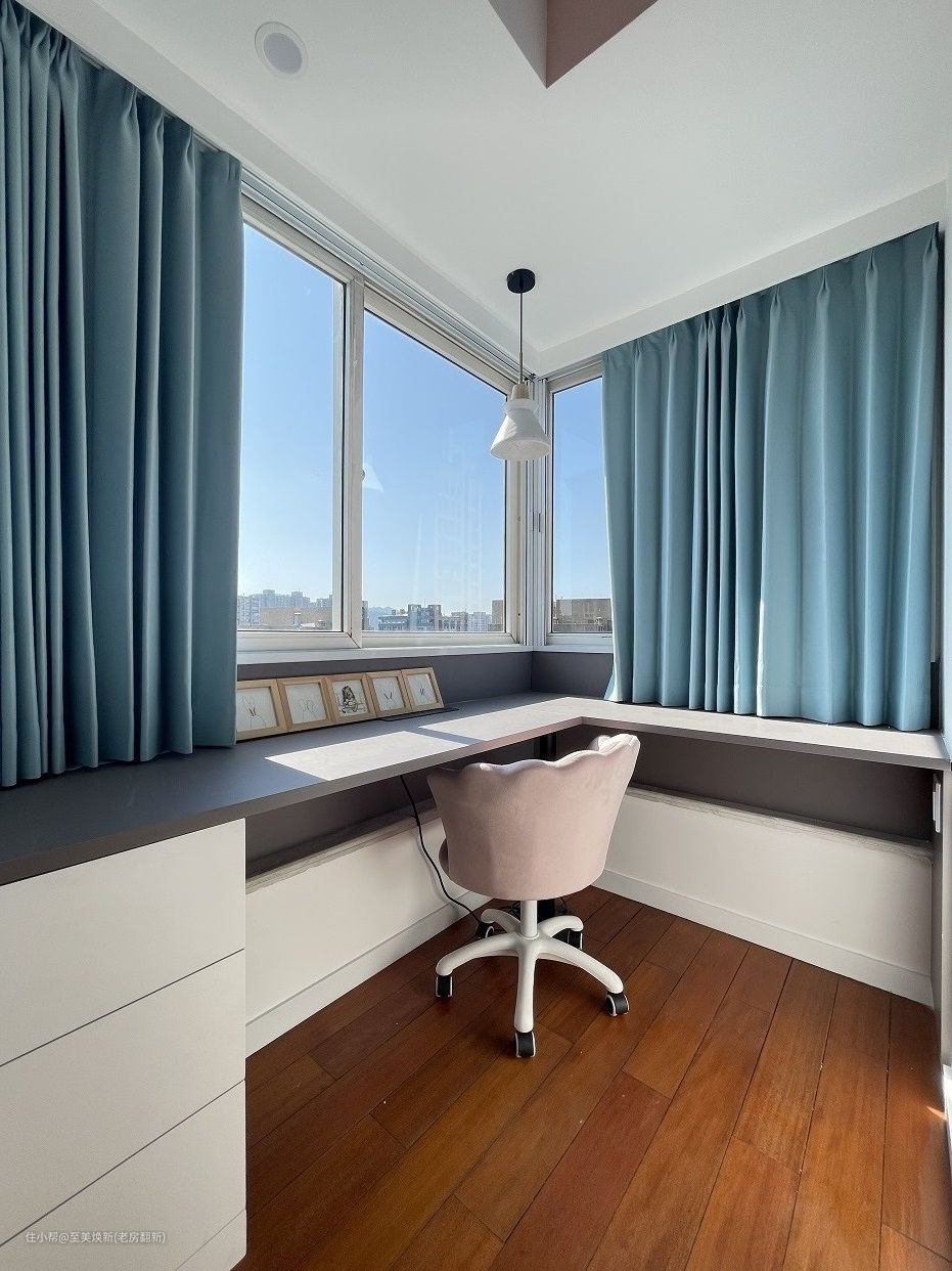 在孩子的小时候就要有良好的学习习惯,设计师在窗户沿墙角处做了一个悬空的L型书桌,配上儿童椅随时调节高度。