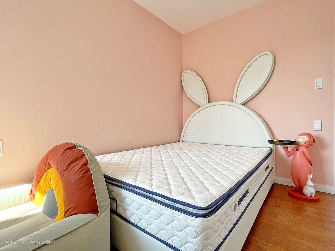床头的兔子耳朵,旁边傲娇小女孩的落地摆件,床尾彩虹懒人沙发满满的卡通元素,是孩子眼中的世界,温馨童趣。