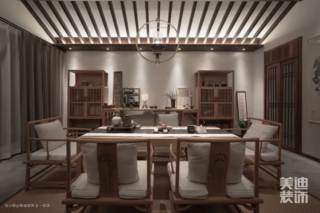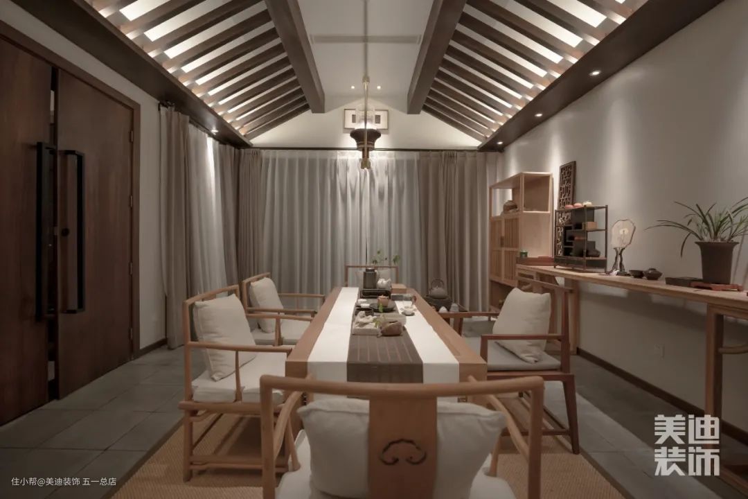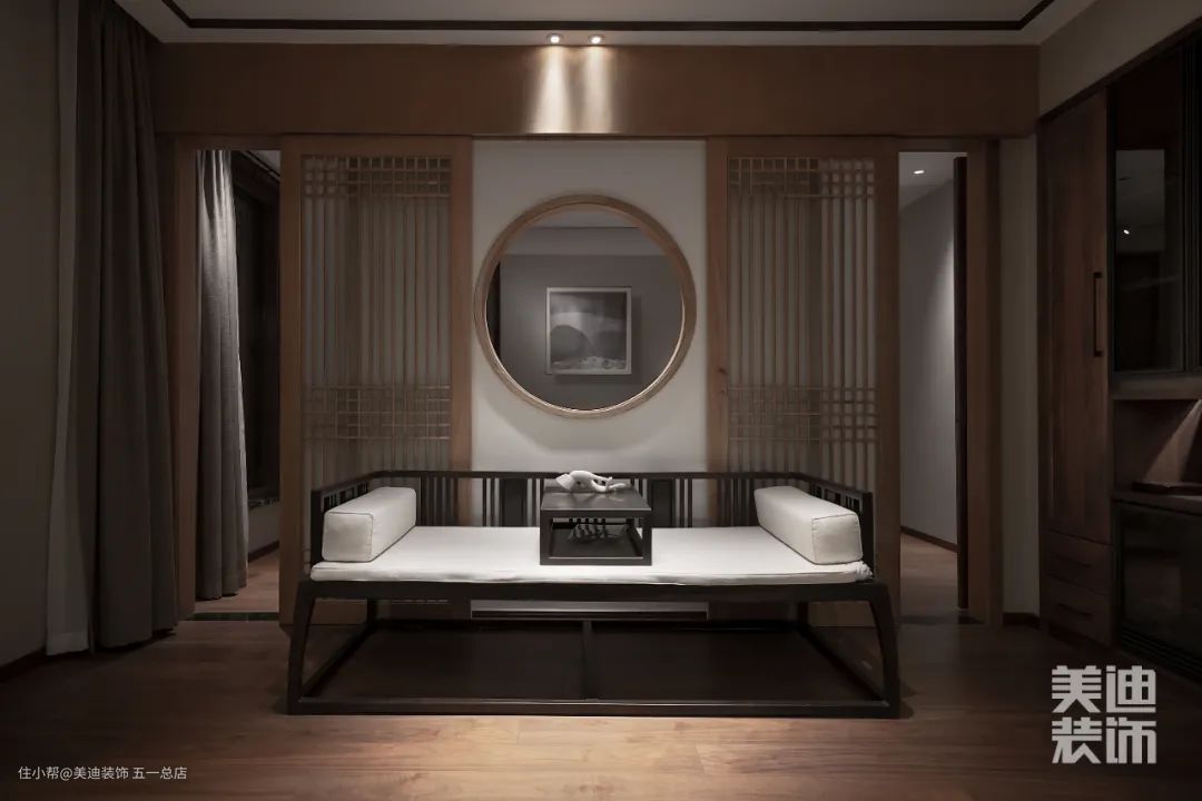 会客室设置的罗汉椅与屏风,在方圆之中将古典文化中的理念刻画地淋漓尽致,原生木料与浅色系布料和谐共生,放大了原有空间感受。