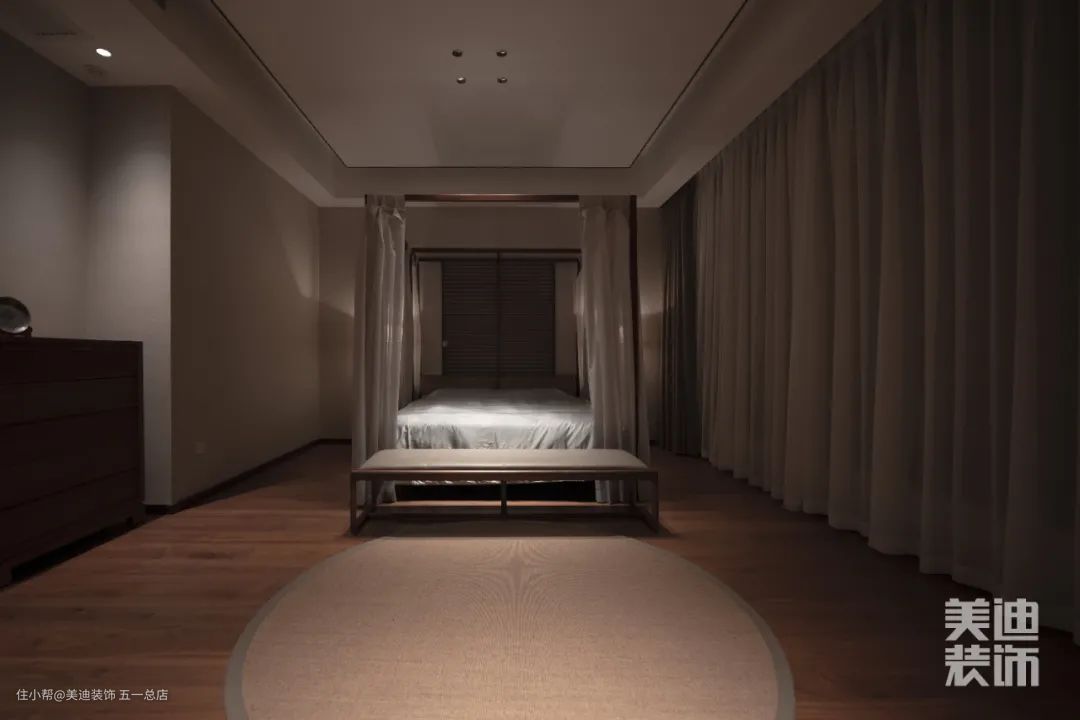 颇具中式气韵的架子床搭配素色寝具,更利于睡眠。草色的圆形地毯,彰显空间自然之美。