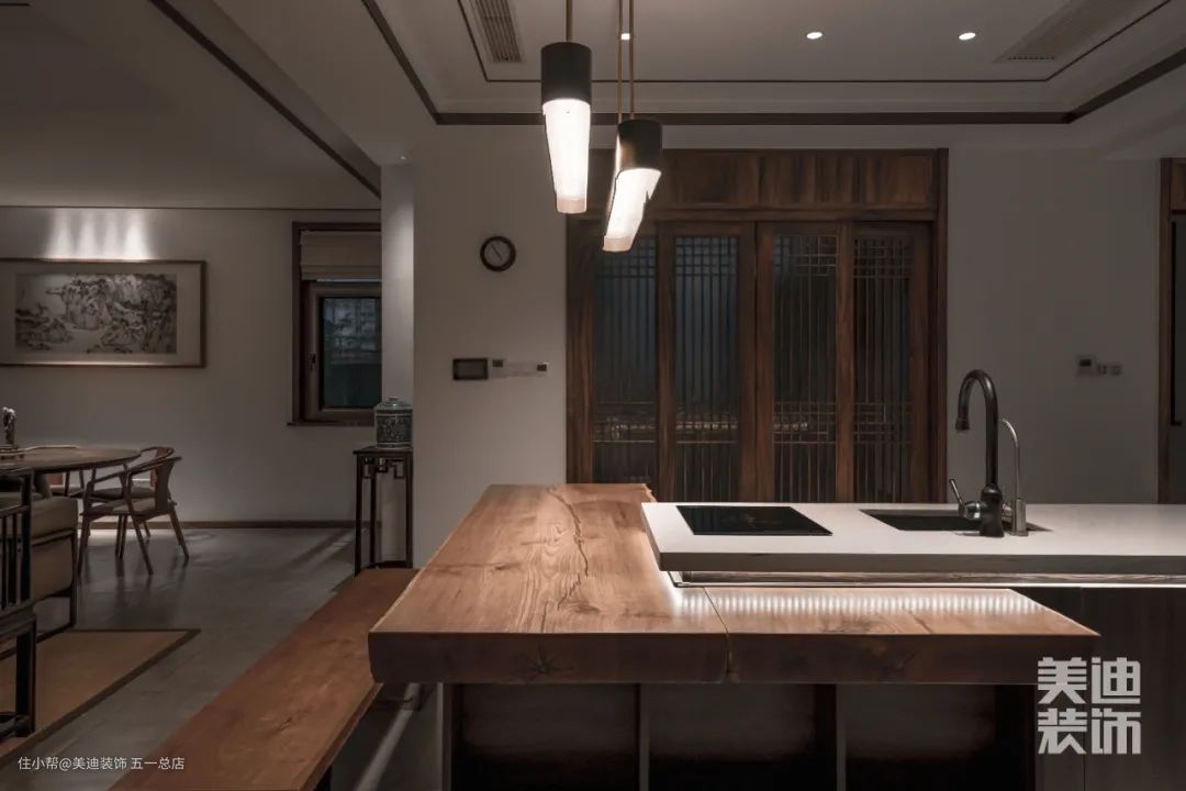 柔和温润的木质与自然随性的石材,填满了整个餐厨空间。