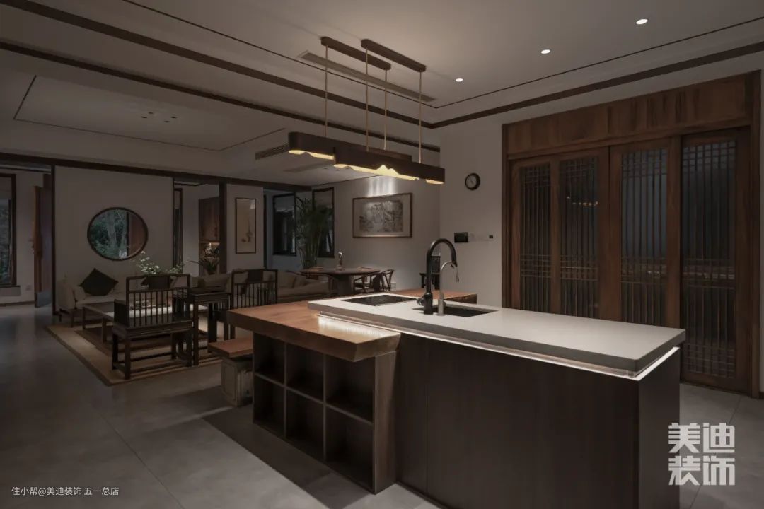 开放式西厨房与吧台连通在一起,让用餐时光更惬意。精巧设计的吊灯,能给予宾客更多遐想。钟情于设计美学的同时,空间实用性也相当重要。