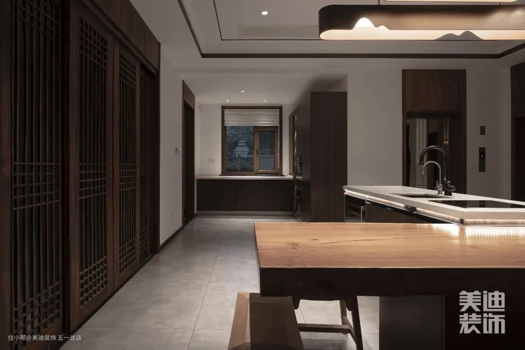 餐厅部分同样是木质为主,中式的博古架,除了是储存物品的餐边柜,亦是赏心悦目的装饰。