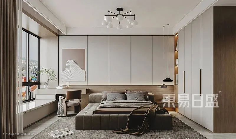 主卧整体采用了暖色的基调,背景墙使用悬挂式橱柜与木饰板做拼接处理,打造美观和功能性兼具的储物空间。靠窗则做了一体化的化妆桌和飘窗,女主人早起化妆、午后休闲都会更加舒适温馨。