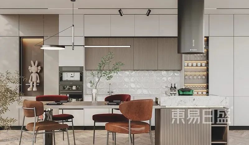 餐厅与西厨做了开放式布局,简洁利落的餐桌搭配中岛台,营造通透敞亮的用餐环境。中岛台的加入,不仅能够分担操作台的压力,同时还能延展视觉空间,打造更加流畅舒适的空间动线。
