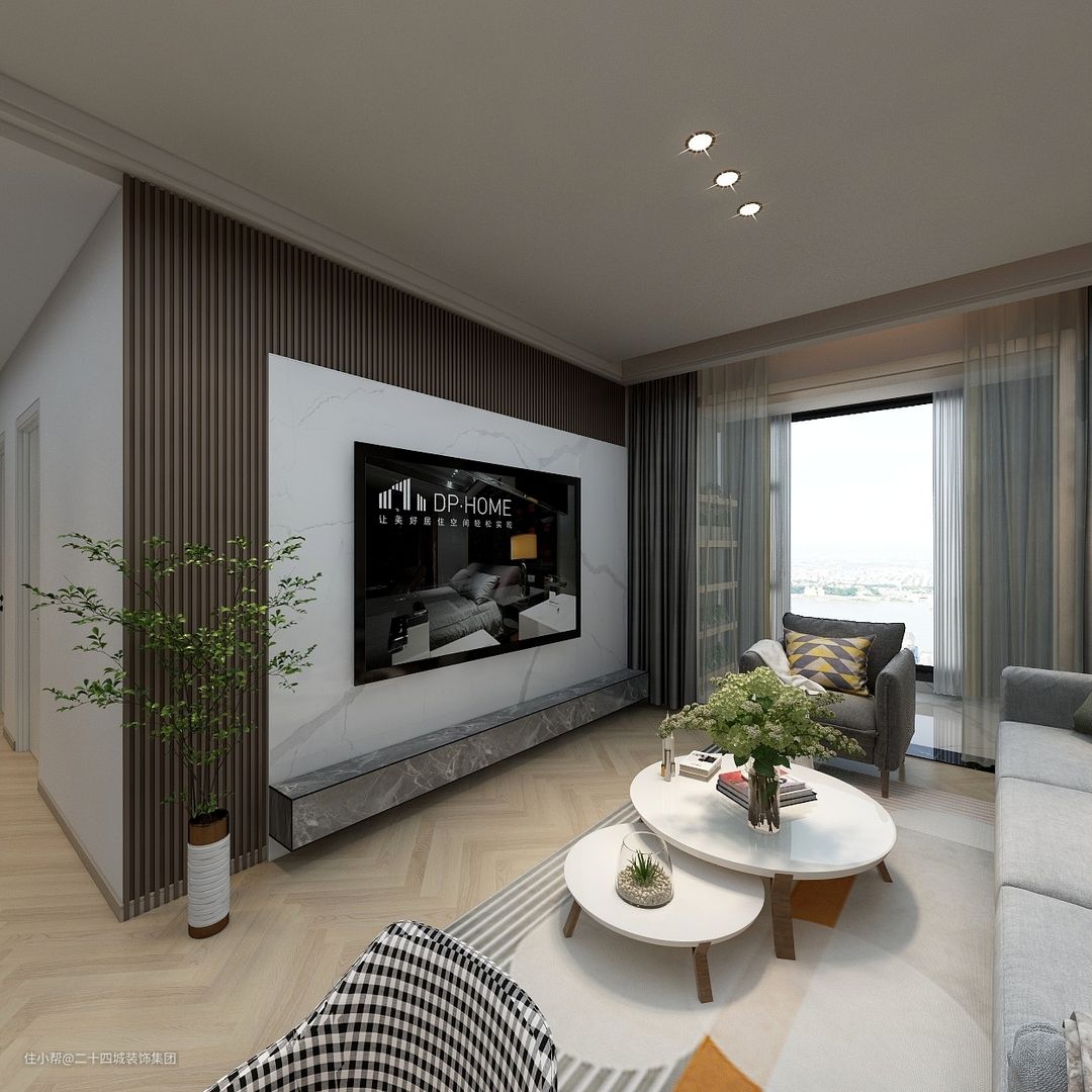 客厅区域没有过多的装饰,浅灰色的沙发搭配大理石茶几和深灰色的单人椅将功能区集中。木质地板也很温暖。