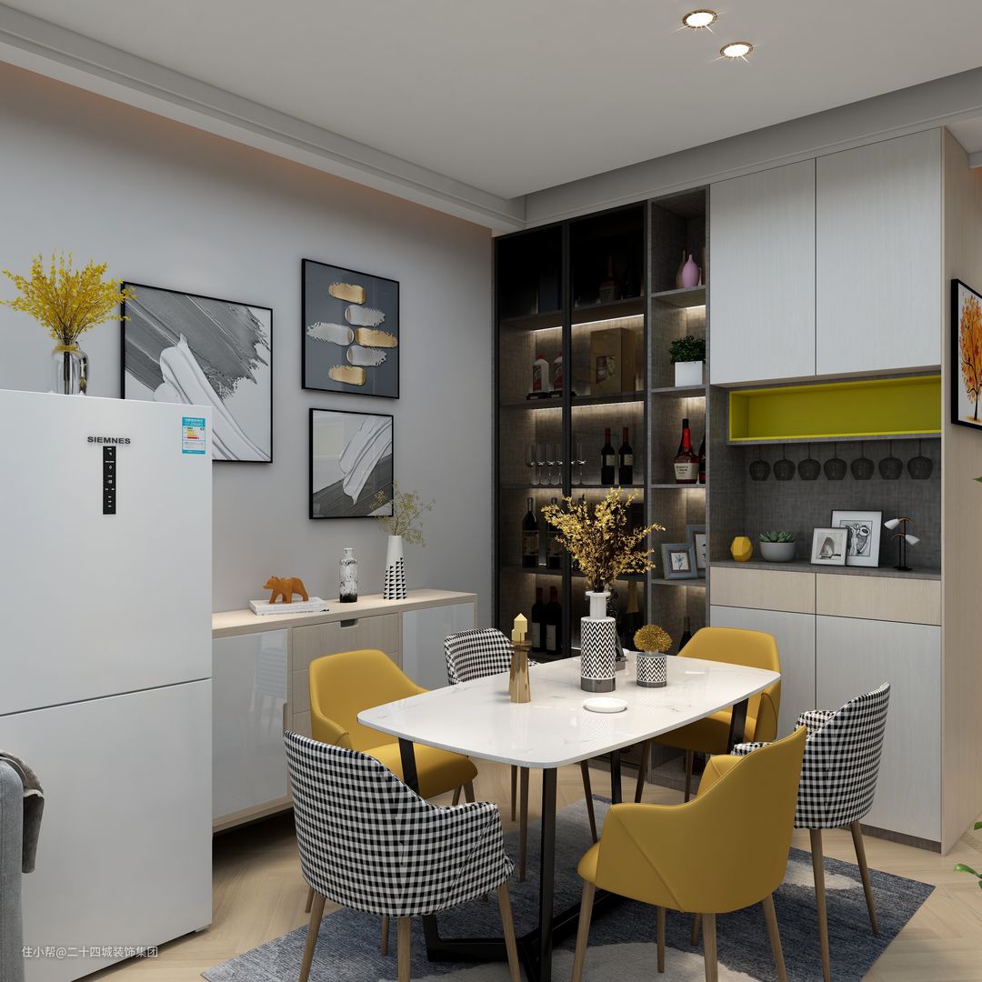 餐厅选用了白色的餐桌,多功能餐边柜采用多层次方格构成,中间采用镂空设计,既能收纳日常餐具,也可作为展示柜摆放酒水及其他装饰品。