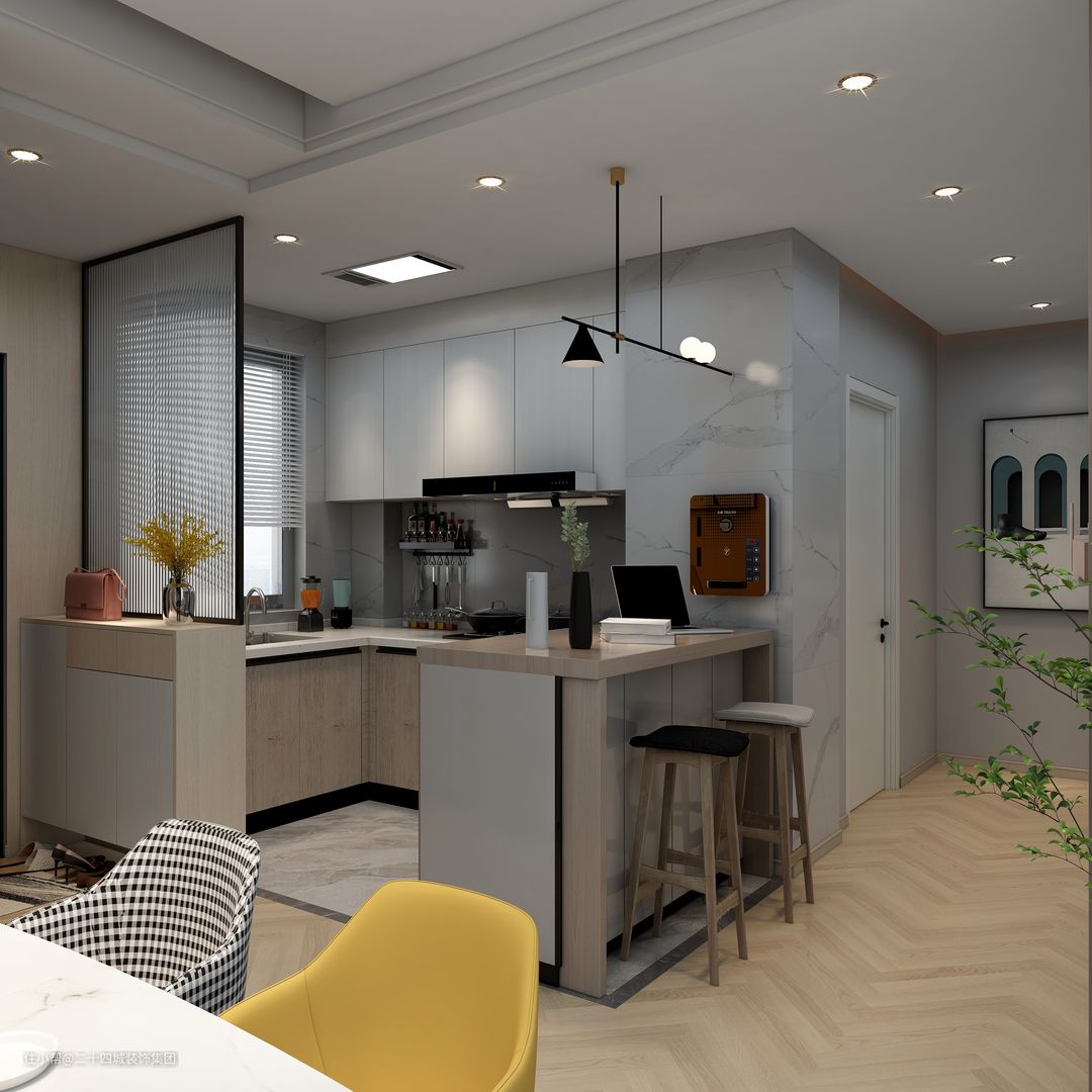 厨房的柜体样式整体房间颜色保持一致,但颜色选择了前浅灰色,也做了半开放式厨房的设计,搭配原木风格的柜门,很有质感。