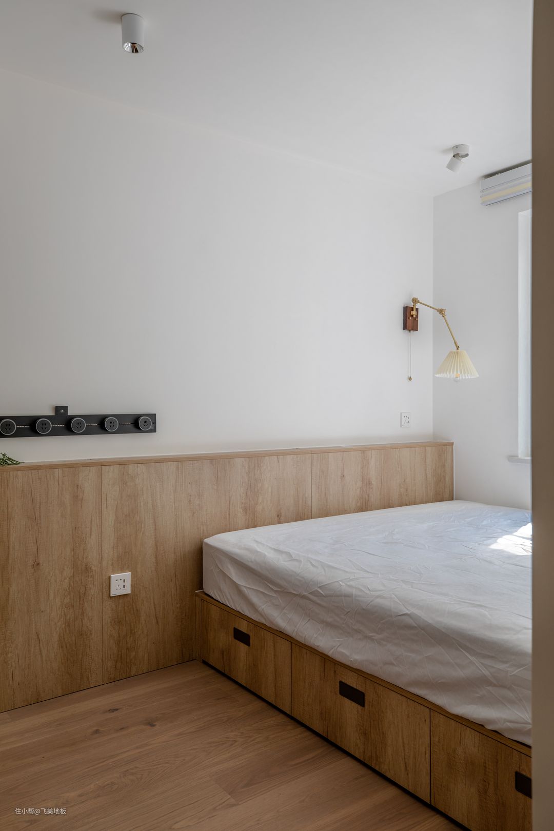 ② 原木风地板+奶油白墙漆:原木风地板冲淡了白色墙漆的冷静,二者融合,相得益彰。