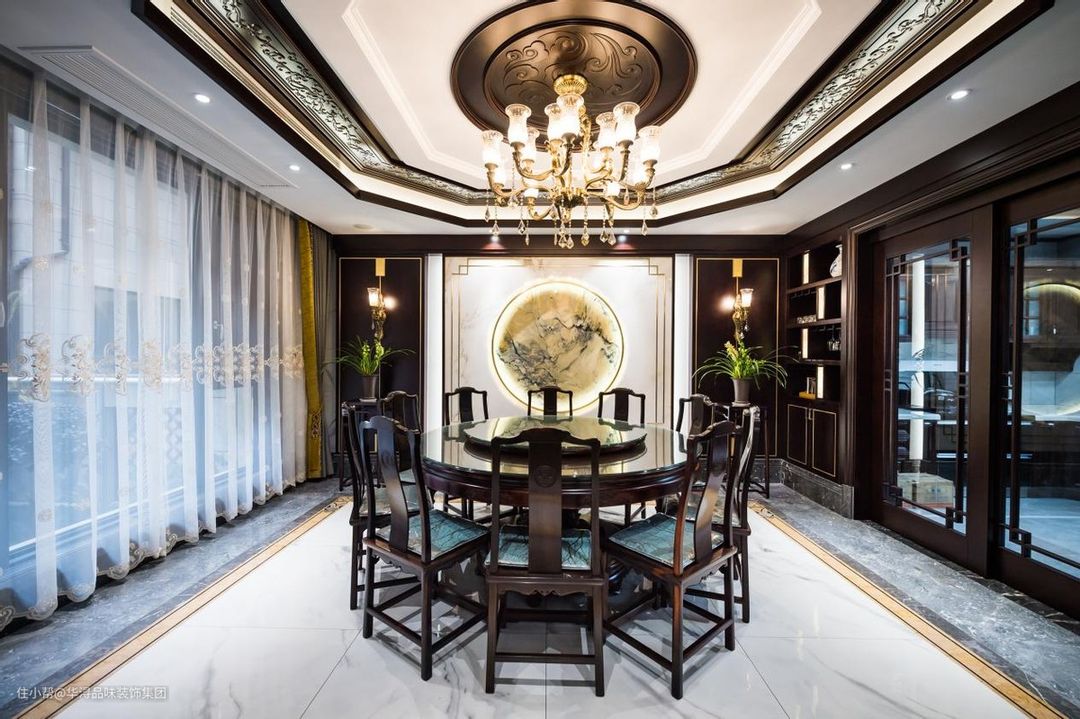 圆代表圆满、团圆的意思,所以在中式家装里经常会选用圆餐桌。餐厅的背景墙相当的华丽,大理石墙面上一幅立体的圆形壁画做了嵌入式的处理,再用灯光加以装饰,太美了。