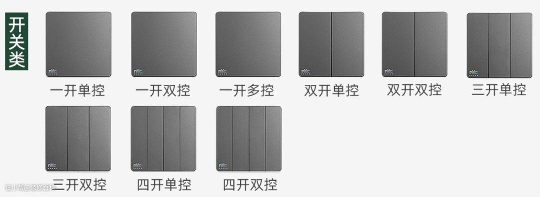 开关:一般根据功能划分,开关可以分为单开单控、双开单(双)控和多开单(多)控,一般空间较小的地方选择单控即可,空间较大或者需要控制的地方多,就可以选择多开多控。市面上最常见的就是86型插座。
