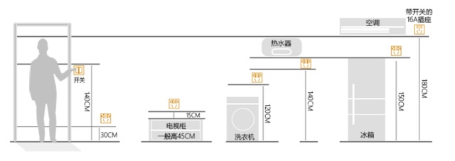 插座:一般电器的电源线长度约为1.5m到2m,最好每隔3m留一个插座;插座一般安装在距地面0.3m高处,洗衣机插座距地1.2m~1.5m,电冰箱插座距地1.5m~1.8m、电热水器插座距地1.4m~1.5m。