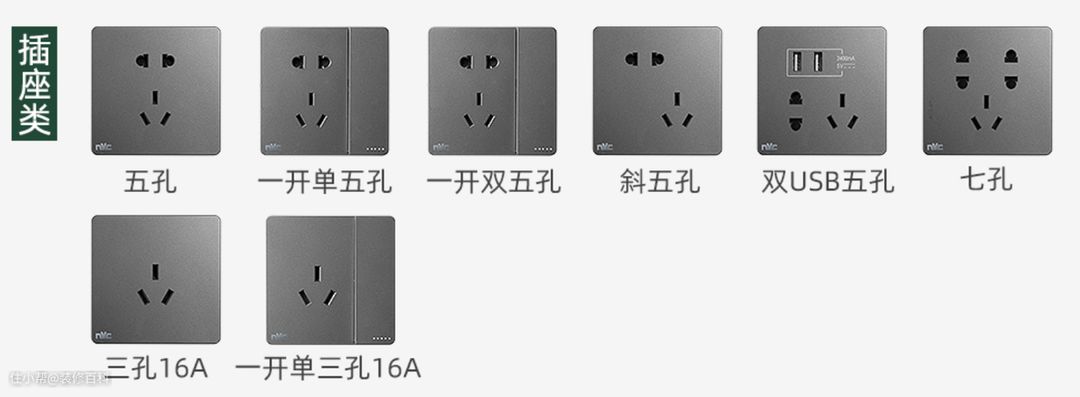 插座:插座规格普通选择10A即可,大功率电器比如电热水器、空调柜机可以选择16A;另外在插孔类型上还提供两孔、三孔、五孔、七孔、USB孔,一般五孔最划算,两个电器可以同时使用。还有一些特殊类型的,比如带USB充电孔插座,如果购买建议选择支持快充的,否则意义不大。