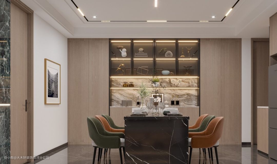 餐厅被厨房半包裹,又与门厅距离较近,空间自如转换,厨房的面积通过生活阳台的改造扩大了,日常起居一个人的空间,居者不喜欢吊柜压迫空间,所以就做了一排底柜。