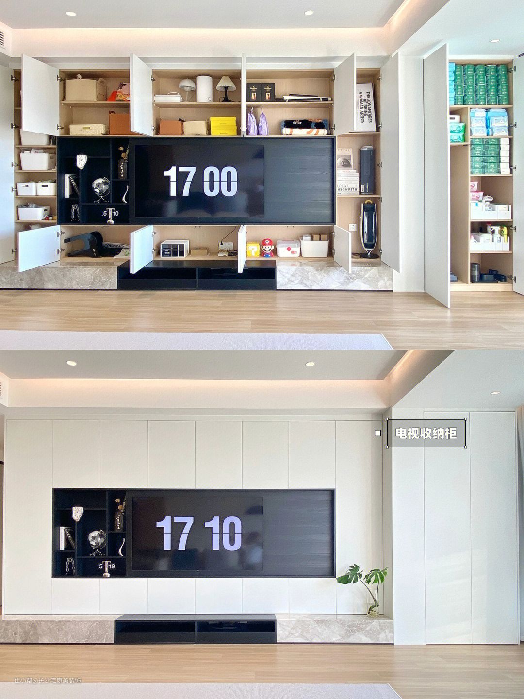 电视背景墙做成整墙收纳柜,东西再多再乱都不怕,关上柜门家里立马显得干净又整洁