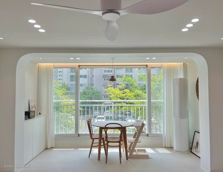 阳台打通,让客厅采光更好,也显得更加通透,再装排简单的地柜,简单又不占地方,再搭配桌椅,把这里当作餐厅或者学习区都可以,为生活提供更多互动的场所。