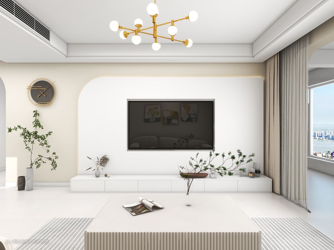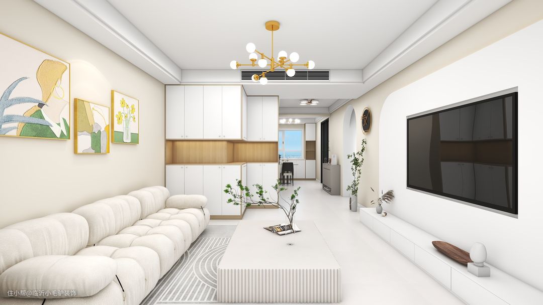 原始户型上并没有进行较多的改造,客厅使用中央空调所以吊顶做了边顶+双眼皮的处理方式,更加美观简洁。整体采用时下流行的奶油风装修,可可蛋奶的乳胶漆颜色相较于大白墙多了一丝温暖柔和,在家具材质的搭配上需要选择一下质感轻松的、造型舒适的,可以呈现出轻盈的质感。
