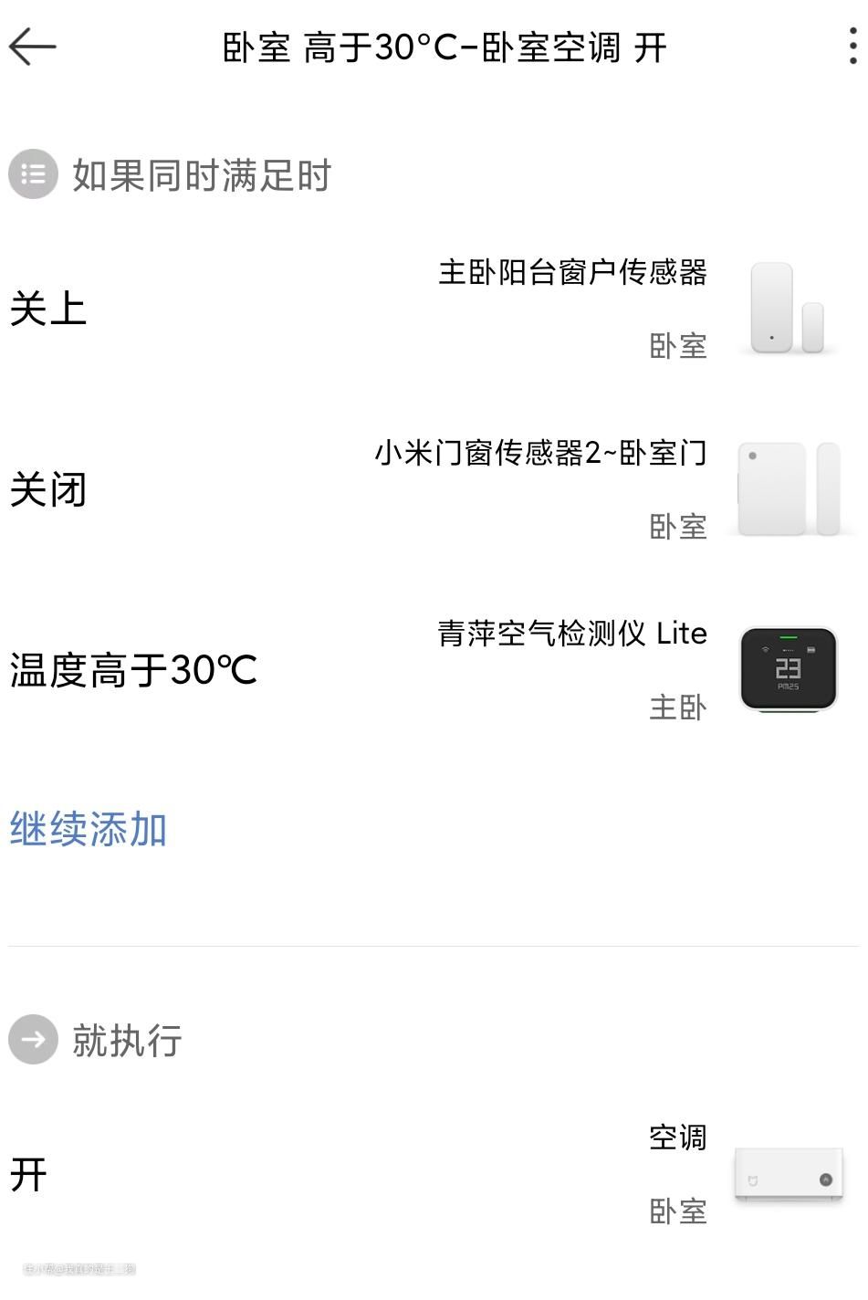 智能家电的好处就是可以实现一些方便的场景自动化,空调自然也是可以的。二狗给自己房间的空调设置了智能联动,如果监测到房间有人同时温度高于30摄氏度可以自动打开空调制冷。为了更精准的匹配家中有人才打开空调,设置了两组门窗传感器都处于关闭状态才执行。当然,还可以搭配智能开窗器使用,远程实现关窗、开机一体化操作。