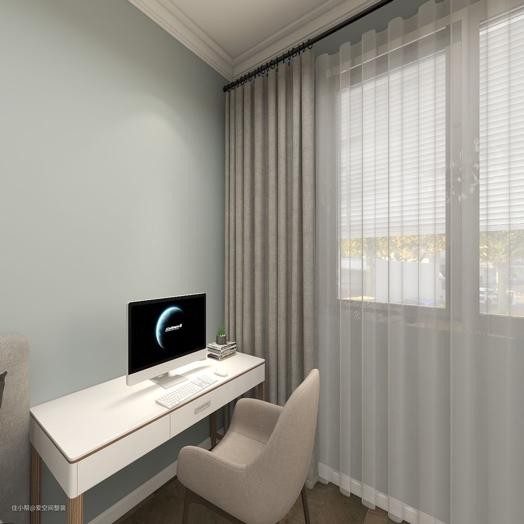 窗帘也选用布艺格格纹理,与对面的衣柜形成统一,配同色系椅子,与墙面乳胶漆冷色调形成对比,窗帘选色恰到好处。