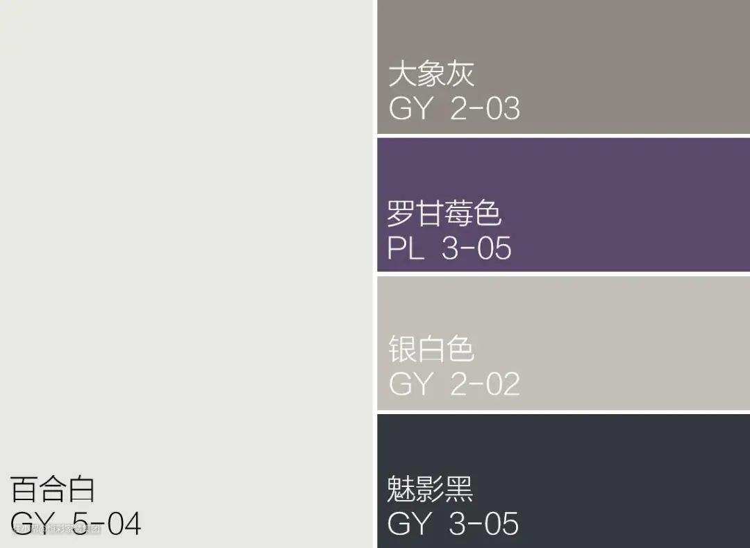 黑白灰是与紫色搭配最为和谐的三色,我们可以用灰色来平衡过饱和紫色,以保证空间的安静;也可以用白色来中合过分艳丽的紫,以确保空间深沉的氛围;甚至我们也可以用黑色,来烘托稍显青涩的浅紫,来加重空间的宁静感。
