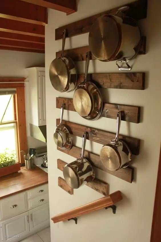 这样的情况下,我们可以想办法把锅挂在墙上,在厨房空间的墙上安装拉杆和挂钩,既能节约空间又方便拿取,真的不失为一种“心机”布置,不过要注意拉杆和钩子的质量要过关,避免掉落。