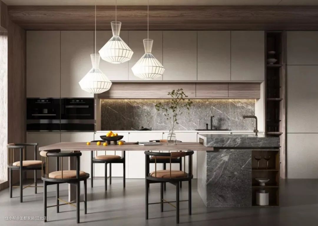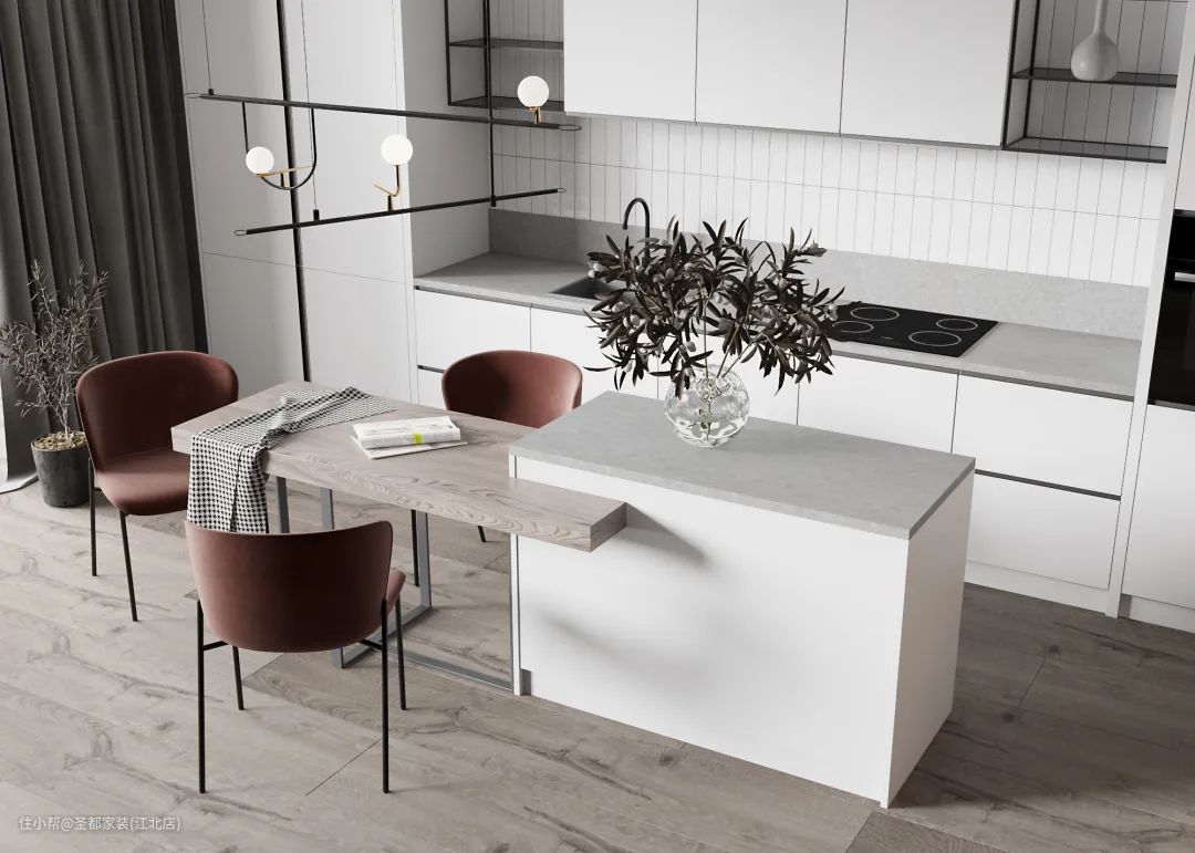 一半中岛台,一半餐厅,大大节省了空间,拿取方便,这就是开放式厨房最大的特点了;岛台与餐桌通常使用拼接设计,会提升餐厨空间的颜值。