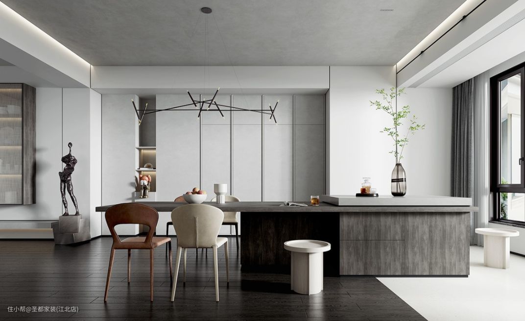 就餐区,吧台要设计成隐藏式或者镂空式,椅子不需要时收起来也不占空间,岛台可配置水槽,嵌入电器,插座侧安,这就是大岛台的任性。