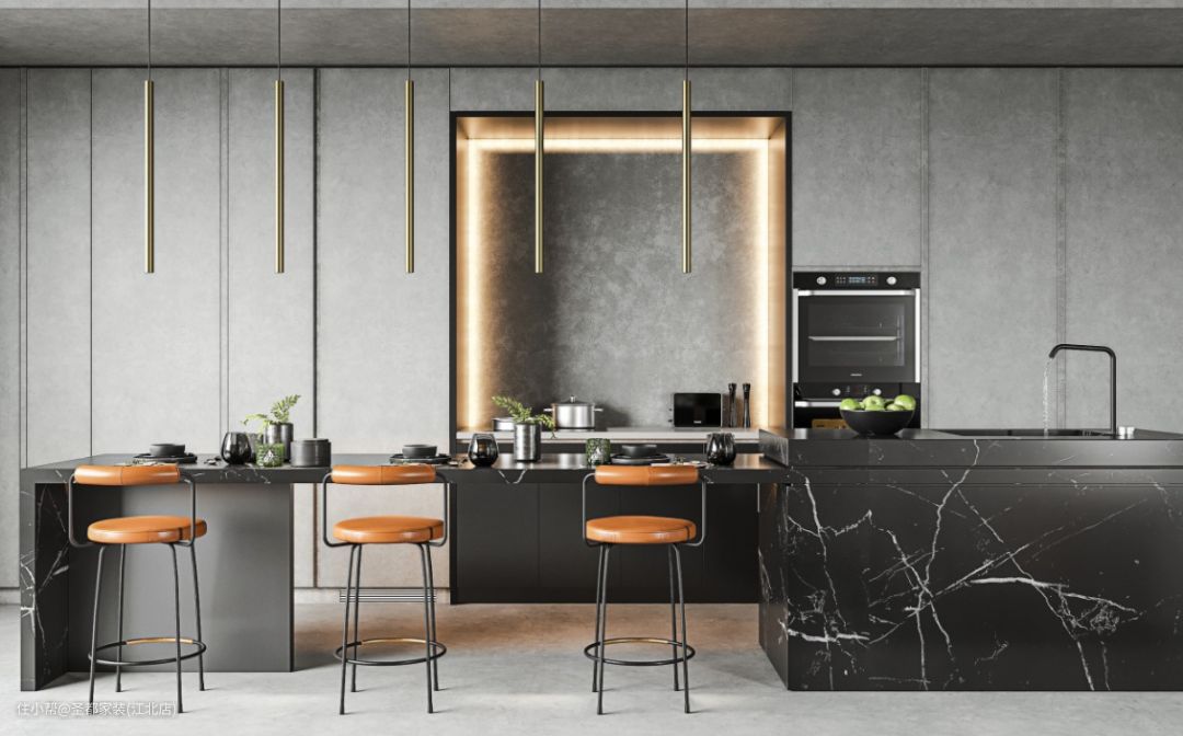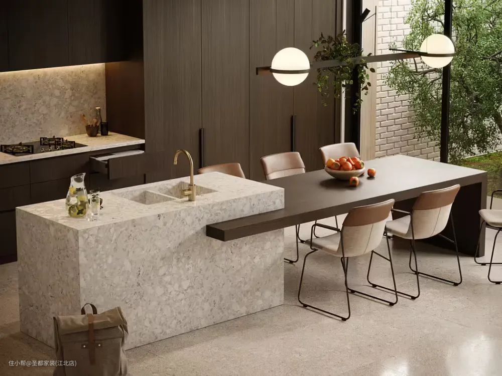 如果想将岛台做延伸式设计,整个餐厨空间就毫无界限感,同一种材质做台桌面,更高大上,但是,岛台和吧台的高度差,可能会影响体验,除非配置高低不同的吧椅。