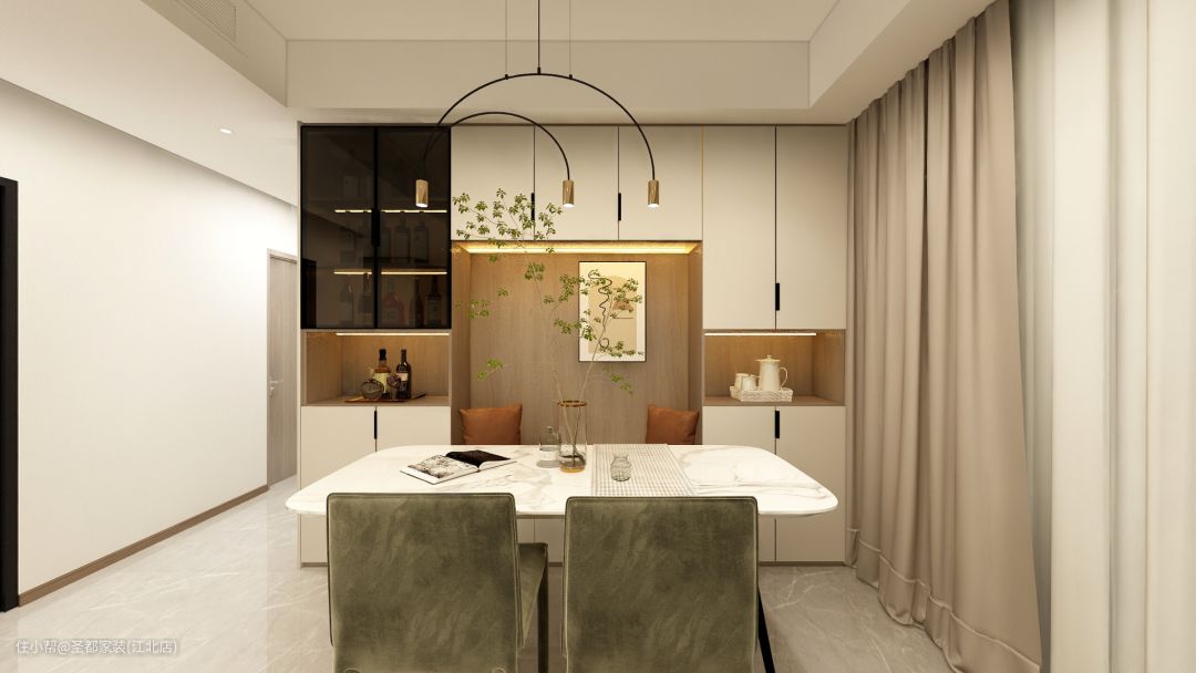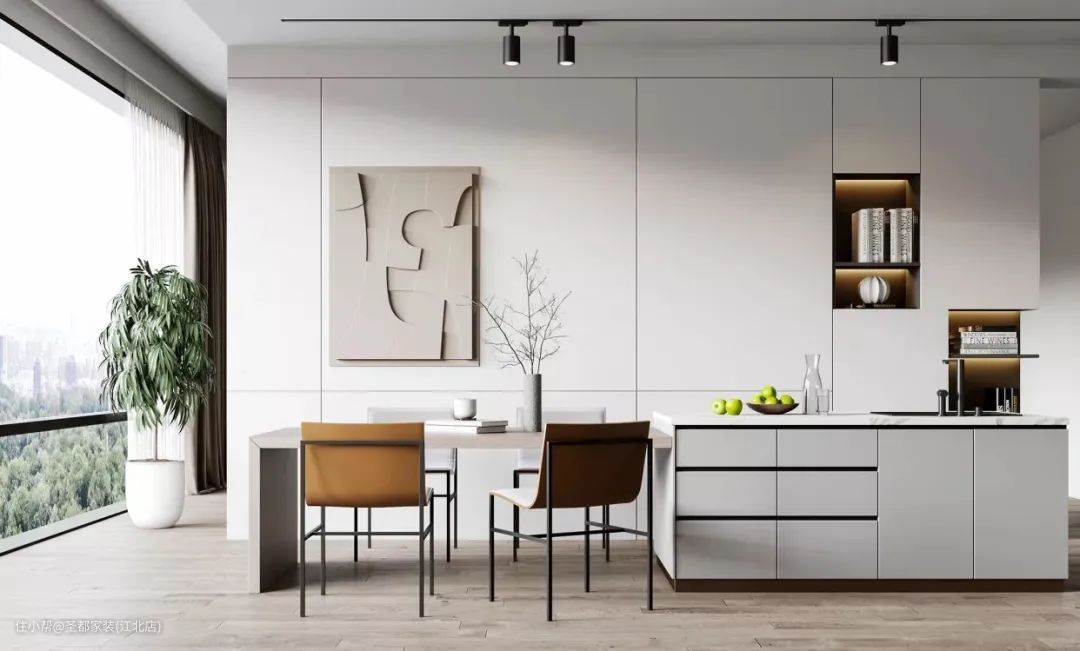 现在很多家庭都弱化了餐厨空间,开放式设计更为讨喜,除了整体设计感强之外,台面平行最省空间,且动线也很合理。