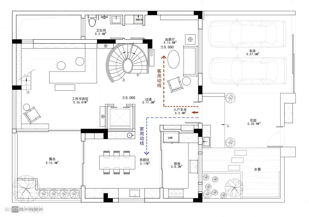 一条动线由玄关进入客厅/起居室,连通室内,为客用动线;另一条由玄关进入储藏室/厨房/家政间,连通收纳和烹饪/清洁区域,为家用动线。