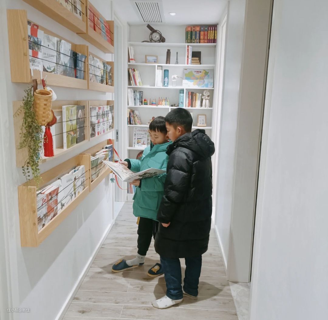 包括走廊墙壁,也是一样,可以借助薄的置物架,为孩子打造一面绘本墙。