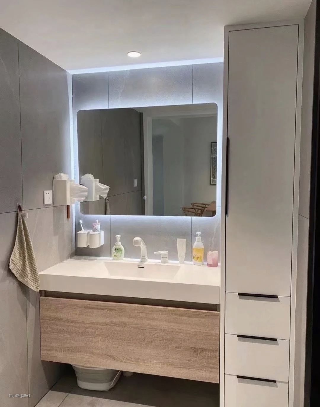 就可以参考这种做法,在浴室柜旁,砌一组薄柜,上层隔板置物,下层抽屉收纳。