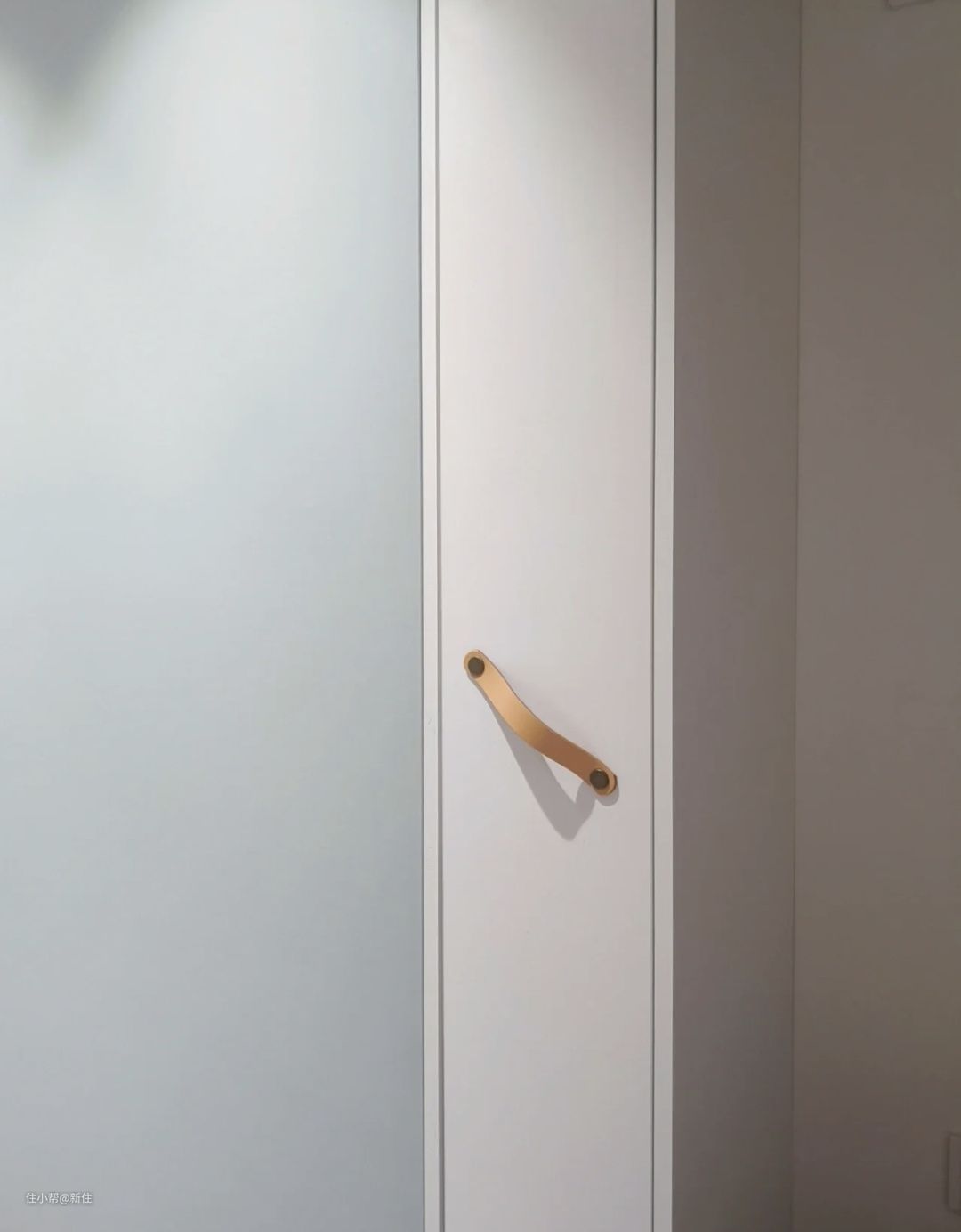 柜门选择与墙体接近的颜色,把手用无把手设计或者隐形把手,存在感很低。
