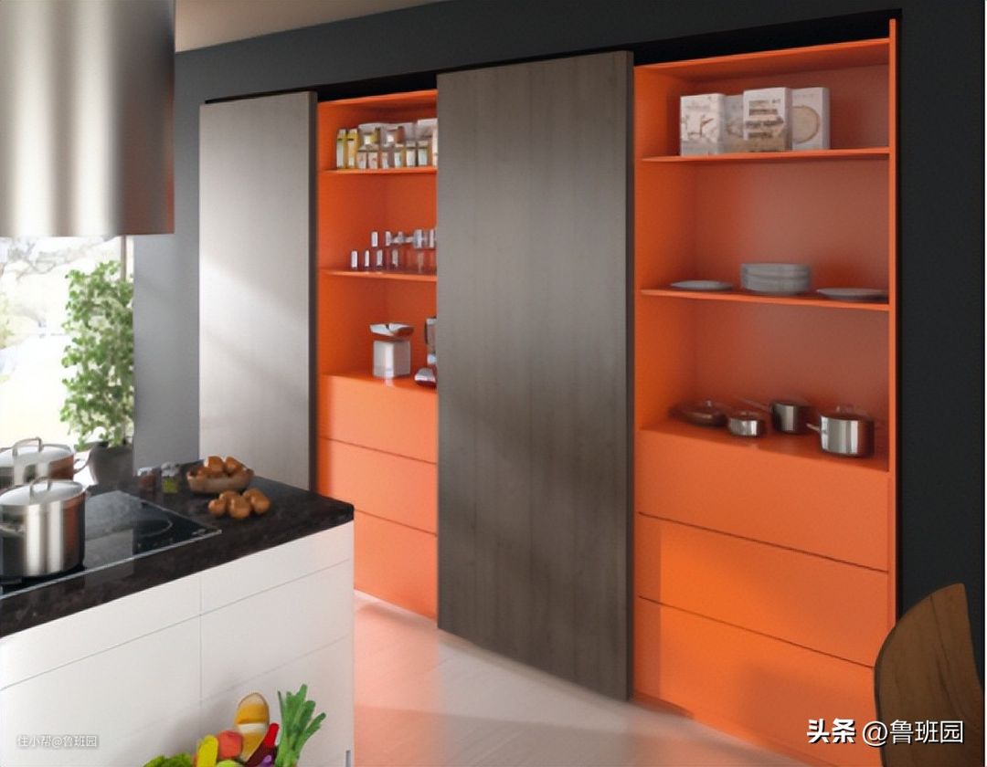 在厨房空间中,移门同样可以灵活使用。比如下图的橱柜,采用顶部承重的两扇移门方式,两扇门属于内置门且都可以进行独立的移动。